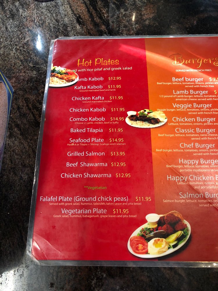 Served with Greek salad, hummus, tabouleh, tahini sauce, and pita bread.